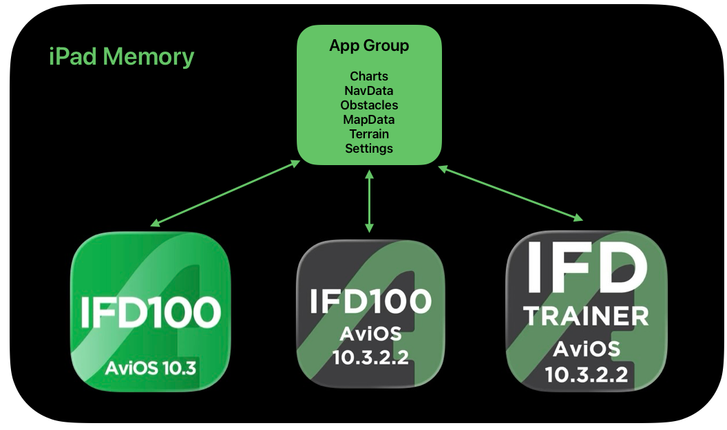 Each app--IFD Trainer, IFD100 10.3, and IFD100 10.3.2.2--has independent memory and each app also shares data within an App Group.